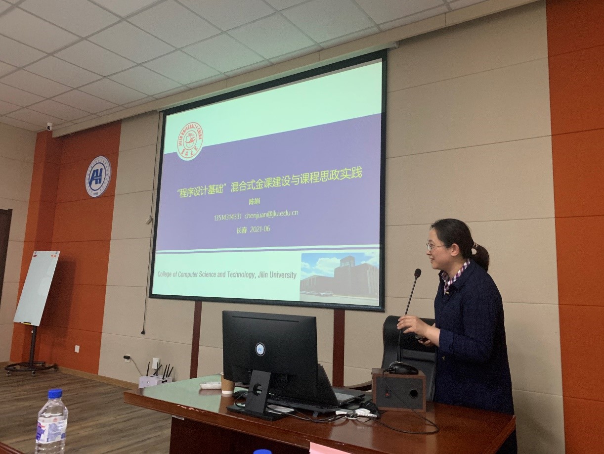 的陈娟副教授介绍了多年带领团队开战混合式教学改革经验,并从课程思政、教学内容、教学模式、教育技术和教学实施等方面分享了“程序设计基础”混合式金课建设与课程思政实践经验。