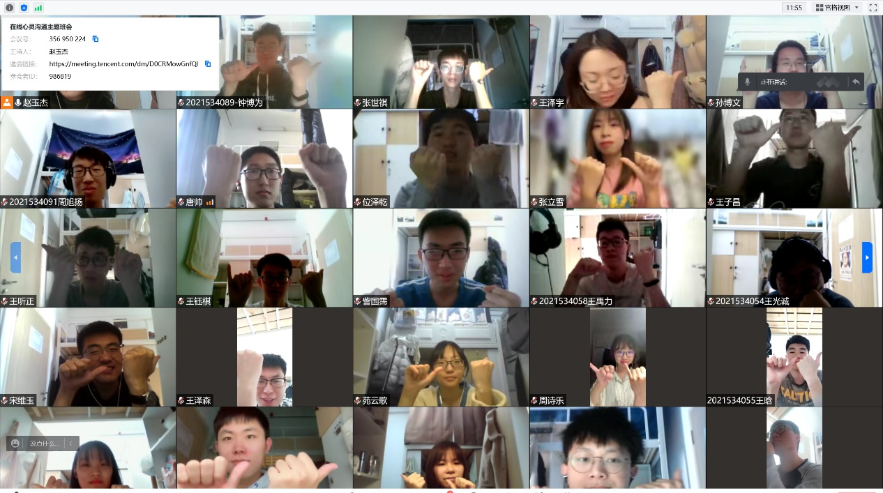 活动共分为6个环节,分别是摇摆时钟、情绪安慰剂、不烦躁的理由、我的一天、见证彼此和我的收获。活动开始,大家纷纷打开摄像头给许久未见的班级同学挥手,在各班心理委员的带领下开始手指操游戏,过程中我们看到了大家久违的笑脸与积极开朗的态度。进入到分享情绪环节,同学们倾诉了面临的压力与苦恼,还有疫情下对学校关怀的感激。在“不烦躁的理由”环节,同学们对提出的令人苦恼的事情进行解答,分享经验,探讨有效解决问题的办法,比如对于久坐身体疼痛,同学们花式给出各种健身链接;有同学因学习拖延而深感焦虑,其他同学分享了制定科学学习计划的好办法。这一个个链接,一份份经验温暖到了在场的每一个小伙伴的心。有问题共同解决也是我们吉大团结奋进精神的一种体现。