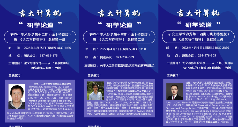 截止目前,学院已经陆续邀请了天津大学的金弟副教授、清华大学的崔鹏副教授以及南京大学的钱超副教授分别给我们带来了图神经网络、人工智能发展趋势以及子集选择等方面的学术讲座,同时三位老师也向我们分享了在论文写作方面的心得。两院学生在每期的学术报告中都受益匪浅,同时这也为我们今后的学习科研存续力量!