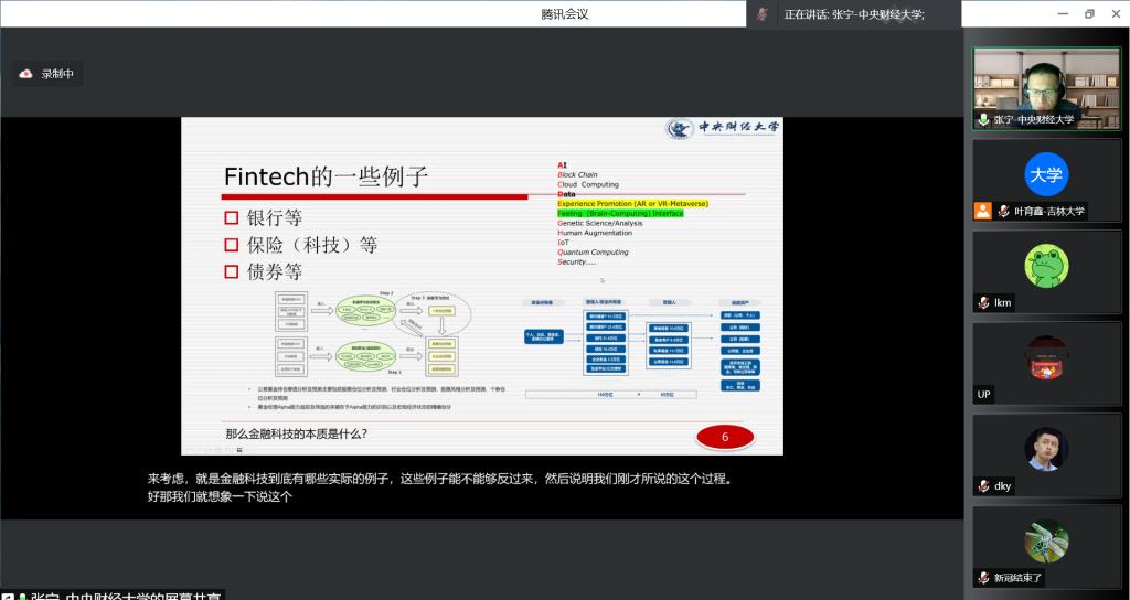 在本次报告中,张宁教授从金融科技的本质出发,以基本的金融现象为对象,分享它所在的更大的宏观逻辑和框架,及数据到知识的演化,即如何重建和重构我们的技术、经济、社会和思想。讲者尤其重点分享了从业验证和时间检验的结论中提炼出的一些工作和思考。报告还介绍了这一过程中智能所起的作用以及数学所赋予的逻辑形成的价值。此外,报告还给出了张宁教授所带领的课题组在金融科技领域取得的部分成果。最后,张宁教授悉心的回答了线上师生的提问。本次报告跨越金融、计算机科学、以及人工智能三大学科,并聚焦于它们共同的逻辑,受到了广大师生的热烈响应。