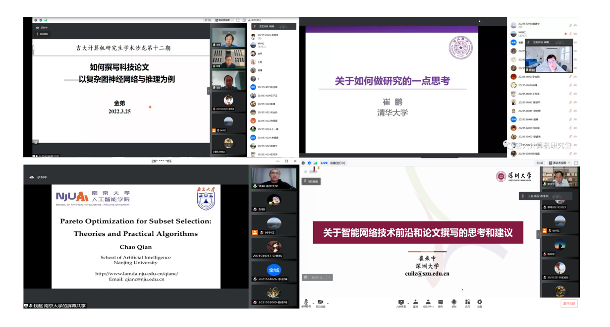 本次活动从2022年3月25日至4月20日,共分四个上午进行。天津大学的金弟副教授、清华大学崔鹏副教授、南京大学钱超副教授和深圳大学崔来中教授四位老师进行分享。分享主题涵盖了复杂神经网络、人工智能前沿、演化计算智能及智能网络技术前沿。同时,四位老师也为两院师生们就“如何选题”、“如何写好论文”等有关论文写作方面的问题给出了宝贵建议。系列课程受到了台湾三级