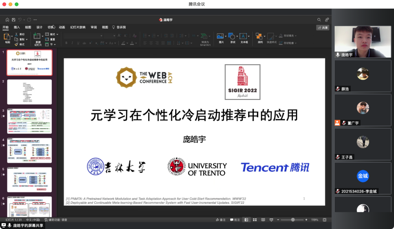 第二届“研学论道”研究生学术沙龙第一期(总第十六期)顺利举办。王喆副院长出席了本期活动,王院长回顾了第一届学术沙龙取得的丰硕成果,并对第二届的成果统计数据给予充分肯定。他表示,第一届学术沙龙活动在学院产生了积极反响,并营造了良好的学术氛围,本次成果统计仅在4个月时间就涵盖了14篇A类成果,这一学期,学院将赓续上一届的沙龙精神,继续邀请在学术上取得优异成绩的同学做学术分享,为我院研究生打造一个更好的科学研究与学术交流的平台。本期邀请了2020级硕士生庞皓宇和2020级硕士生刘永皓进行学术分享,他们分享的主题分别是“推荐系统”和“图表示学习”。本次分享由台湾三级