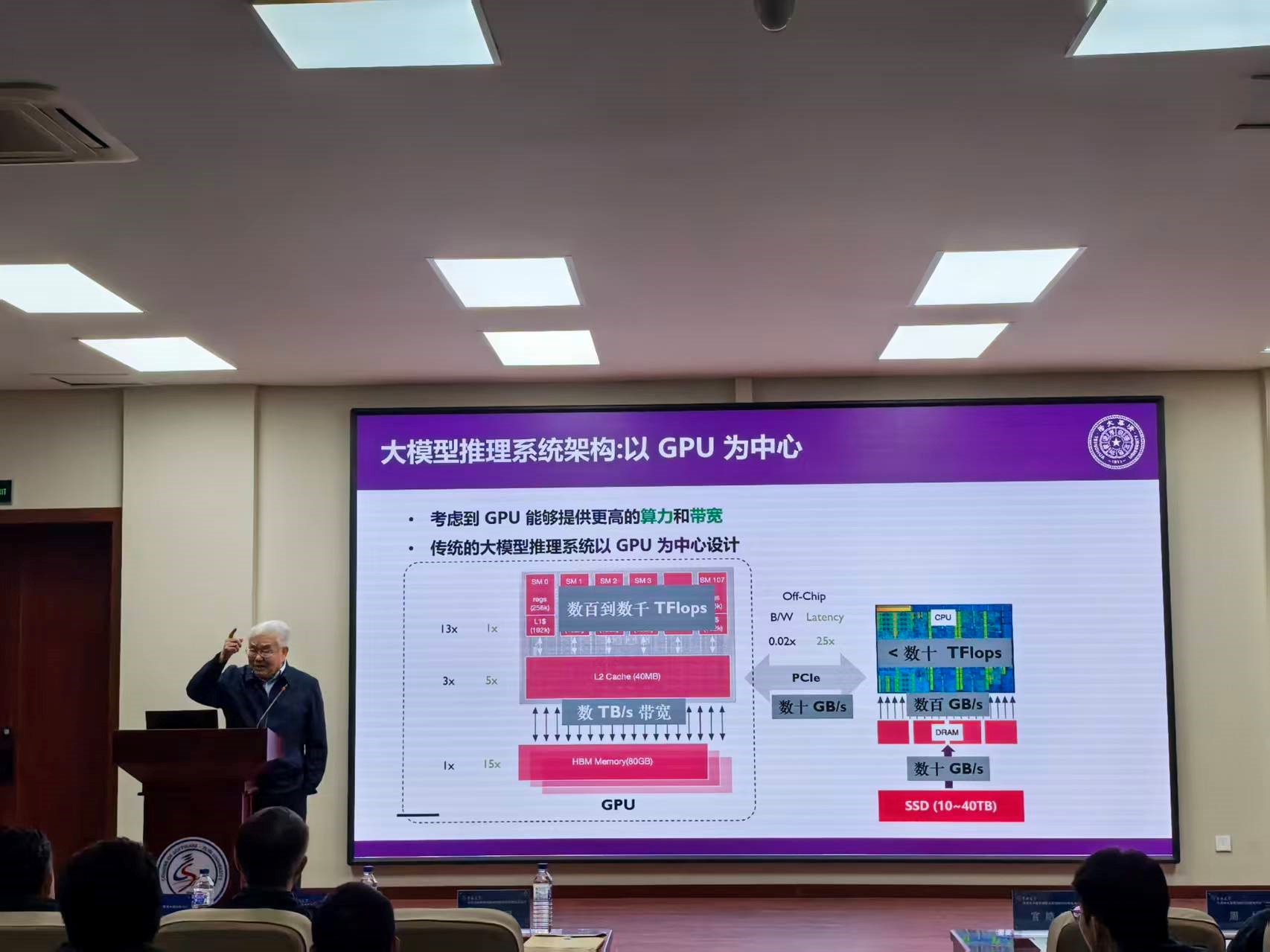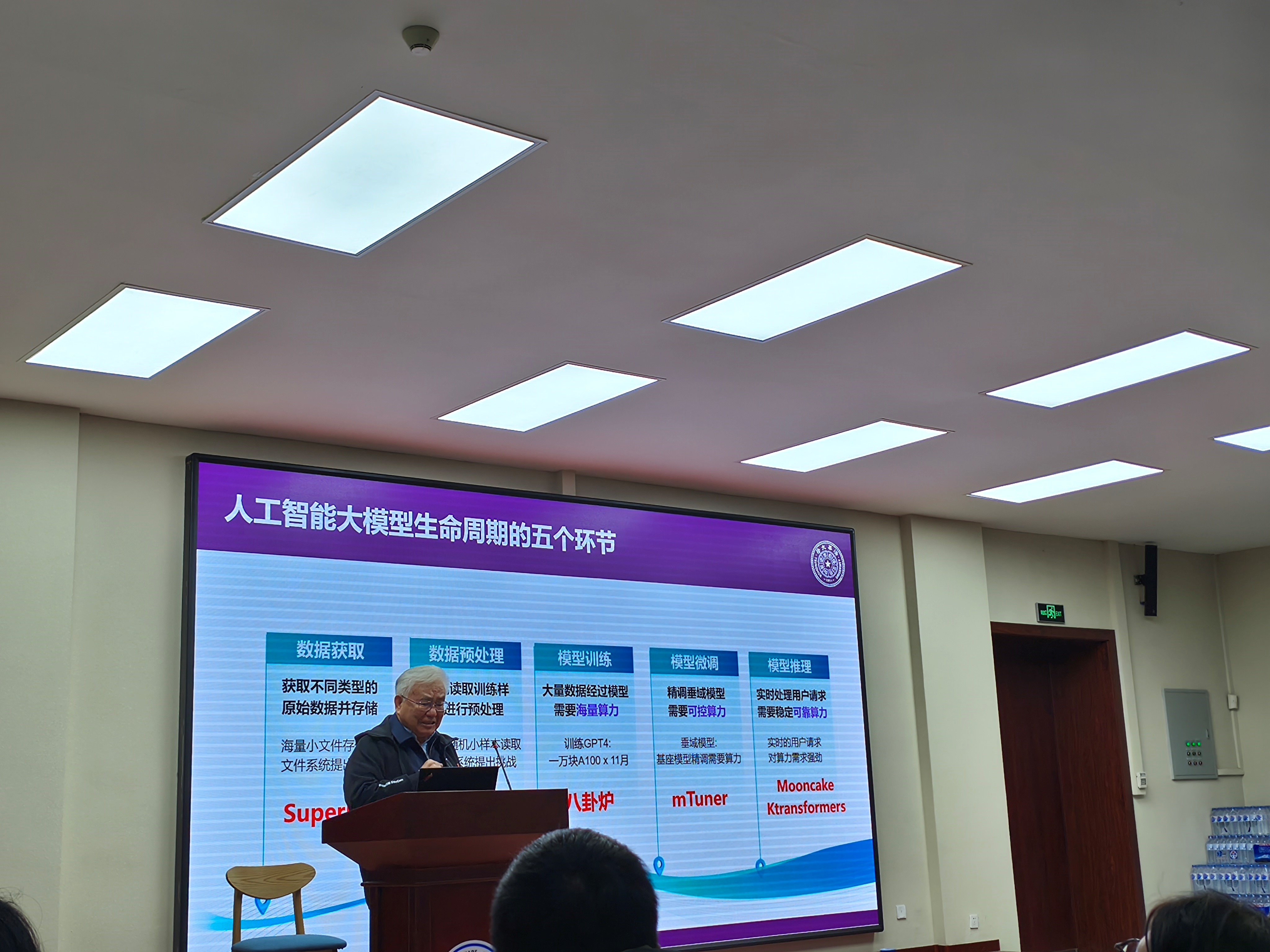 郑纬民院士长期从事高性能计算机体系结构、并行算法和系统研究。讲座中,郑纬民院士通过人工智能大模型生命周期的五个环节,数据获取、数据预处理、模型训练、模型微调和模型推理,分析现有系统软件,面向新的工作负载存在哪些问题,为大模型设计的系统又存在哪些挑战,提出了针对大语言模型推理过程中关键技术挑战的架构解决方案。讲座重点阐述了GPU内存与带宽挑战、KV-Cache存储与传输瓶颈、Mooncake架构、KTransformers以及行业应用与开源生态,通过“以存储换计算”(Mooncake)和“以存储增强计算”(KTransformers)两大策略,显著降低LLM推理成本与硬件门槛,推动大模型技术向普及化、个人化发展,使AI PC从概念走向现实。