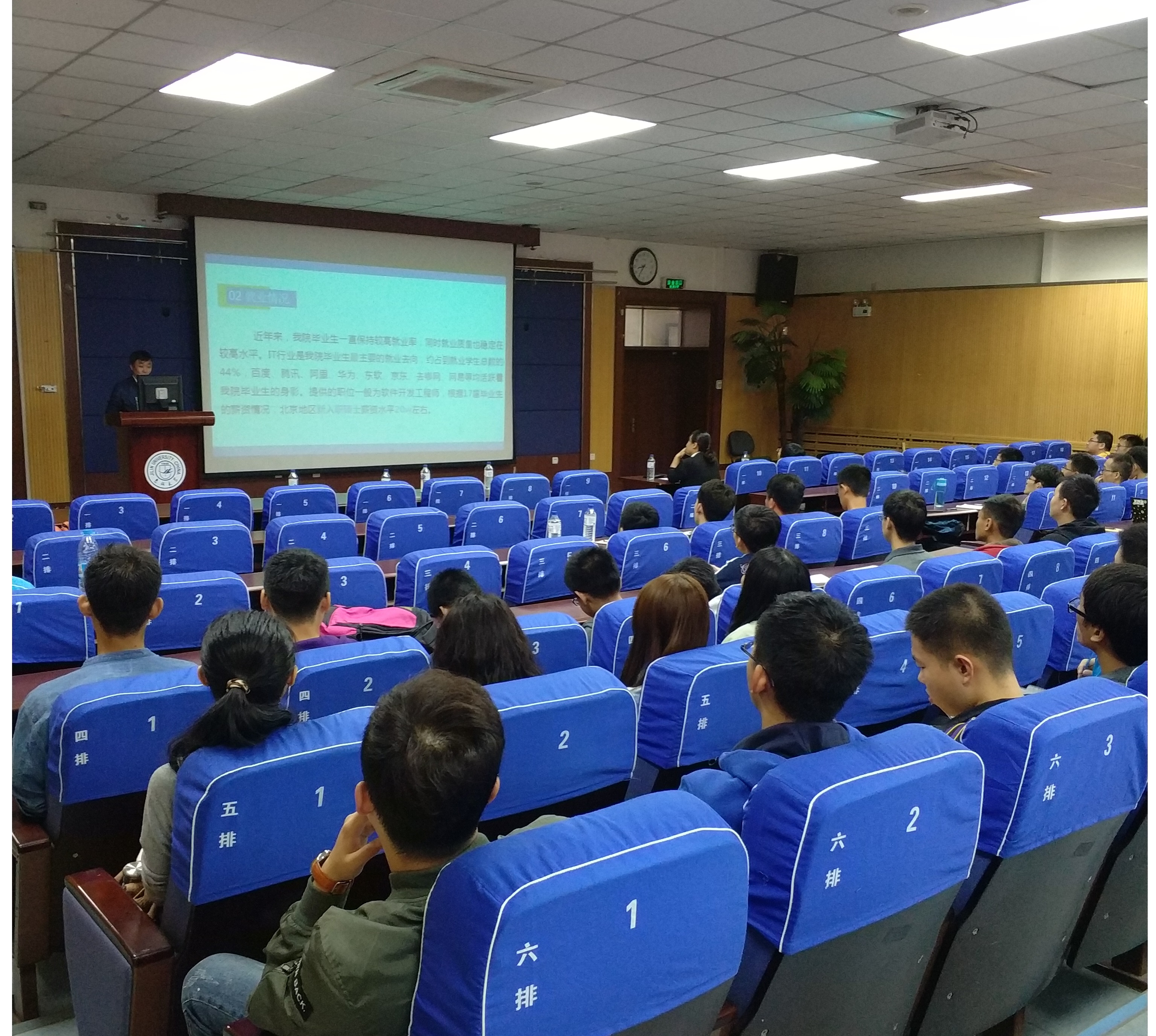 随后由研究生办公室老师对学科简介及研究生培养进行阐述,对研究生培养,论文写作,海外交流等均进行了详细的讲解,同学们全神贯注地倾听老师的讲话,对学院的学科设置和科研实力有了更深的认识。随后,对研究生培养相关环节进行了具体详细的说明,对同学们所关心的选课、课程安排、考试管理、成绩管理、奖学金评定以及国际交流一一进行了介绍。