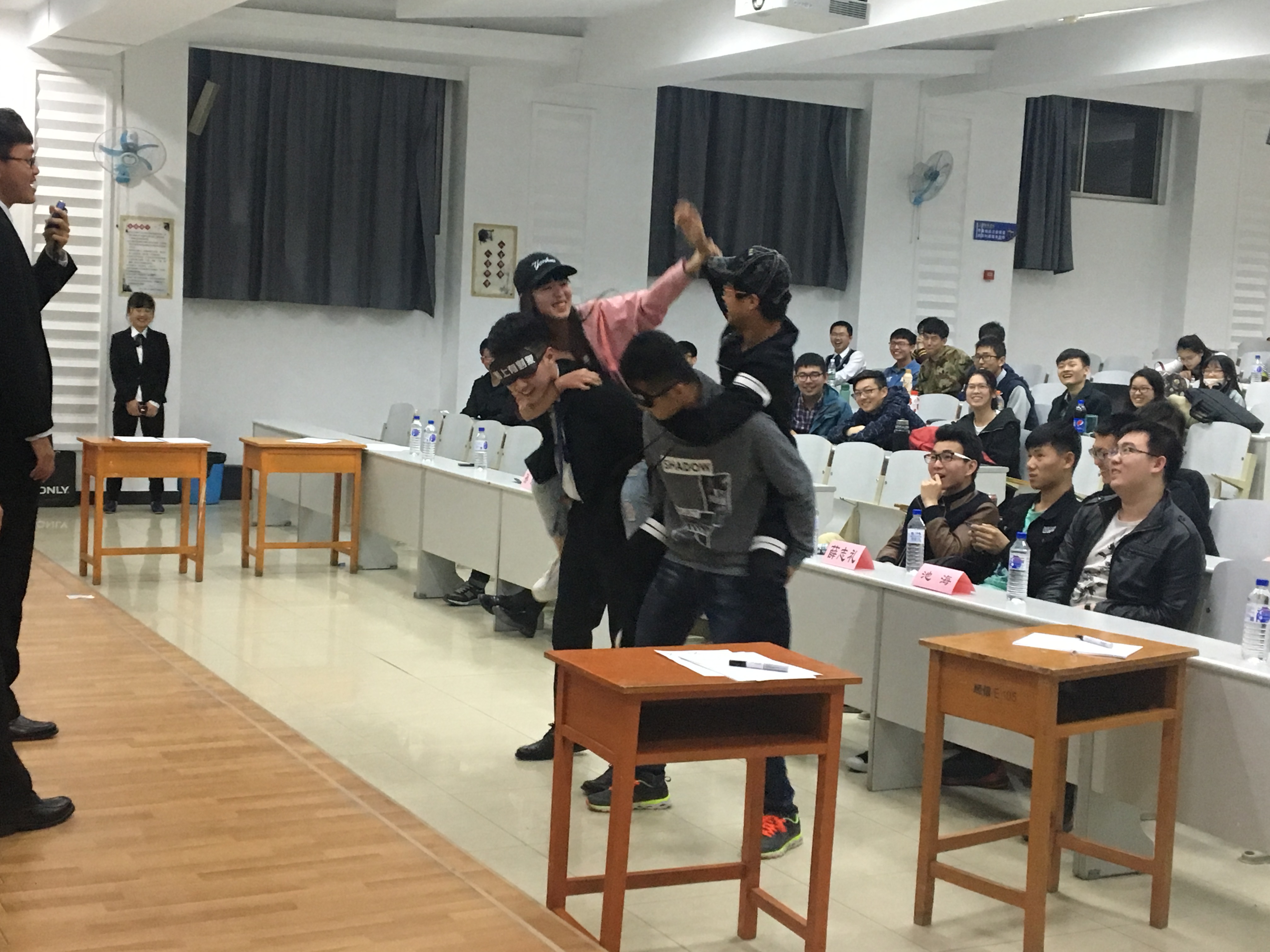 在主持人精彩的开场白过后,比赛开始。在五道必答题的热身结束后,便是精彩的抢答环节。参赛选手积极参与,争相举手,场面格外热闹,观众也阵阵喝彩。伴随着主持人宣布最后进入决赛的名单,抢答环节也终于结束,七支队伍中有四支队伍成功闯入决赛。在竞赛间歇中,他们还组织了趣味游戏环节。主席团、参赛选手们均派出代表参加了游戏。主持人的幽默风趣,参与游戏的同学们的全身心参与,使得大家在严肃的两会知识竞赛中渐渐放松下来。在最后的决赛中,由参赛选手选择比赛难度进行最后角逐,竞赛主要就医疗方面、人民币汇率、建成小康社会的渠道等方面进行了问答,看着各队分数的不断拉开,题目难度不断加大,观众也不得不惊叹选手的智慧和题目的巧妙。比赛最后,三支队伍脱颖而出,分别获得了一、二、三等奖,获得了精美的奖品。